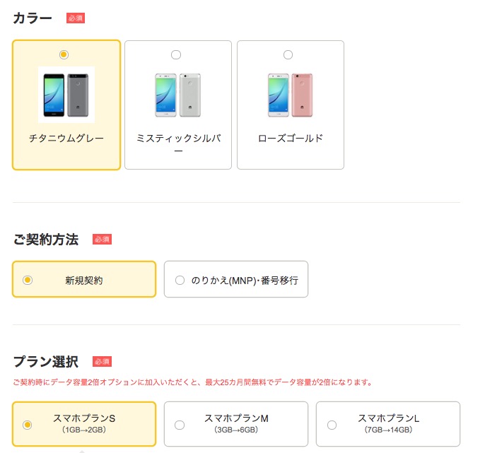 必要情報として、下記のSIMサイズ、契約方法、料金プラン、必要であれば家族割引にチェック