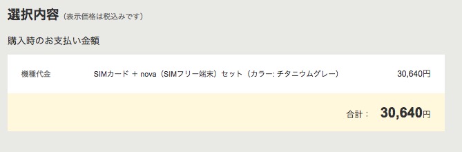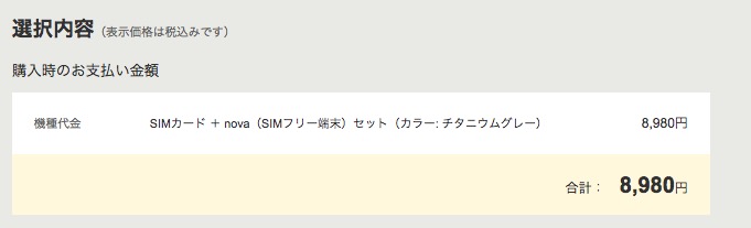 ⑥お申し込みページに入るので、そのまま契約へ進む契約の画面に進むと下の方に機種の価格が表示されるのですが、プランによって割引額が変わります。例えばHUAWAI novaを選択した場合は下記のような画面になります。