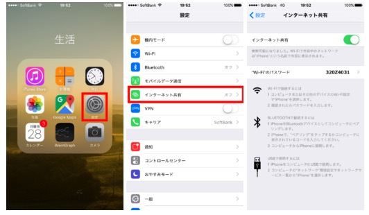 iPhoneの設定>インターネット共有→インターネット共有をON