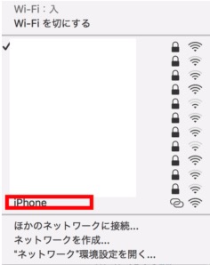 パソコン側の設定はiPhoneでテザリングをした場合、パソコンのWiFiをクリックするとiPhoneと出ているのでそれをクリックすれば、iPhoneに接続できる。