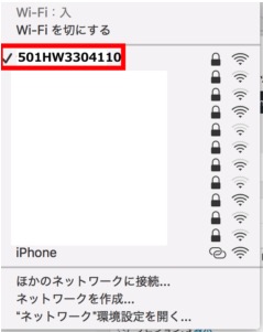 パソコン側の設定はiPhoneでテザリングをした場合、パソコンのWiFiをクリックするとiPhoneと出ているのでそれをクリックすれば、iPhoneに接続できる。